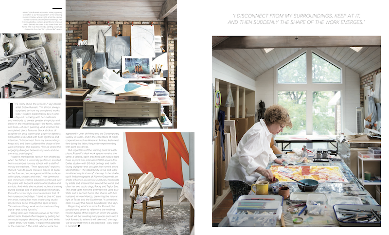 But regardless of the starting point of each piece, Russell’s ideal work space remains the same: a serene, open area filled with natural light. Case in point: her estimated 2,000-square-foot Dallas studio—with 20-foot ceilings and north- facing skylights—that occupies her home’s entire second floor. “The opportunity to live and work simultaneously is a luxury,” she says. In her studio, you’ll find photographs of Alberto Giacometti, an artistic influence, as well as sculptures, handcrafts by artists and artisans from around the world, and often her two studio dogs, Rocky and Taylor Sue. The artist splits her time between the Lone Star State and a second home she shares with her husband in New Mexico, preferring the natural light of Texas and the Southwest. “It unleashes color in a way that has no boundaries,” she says.