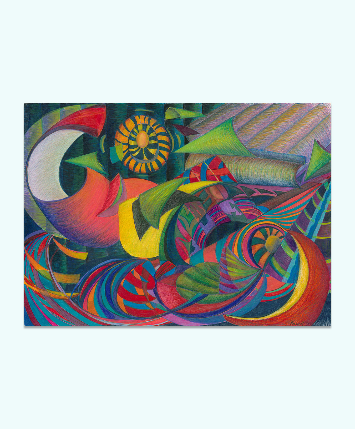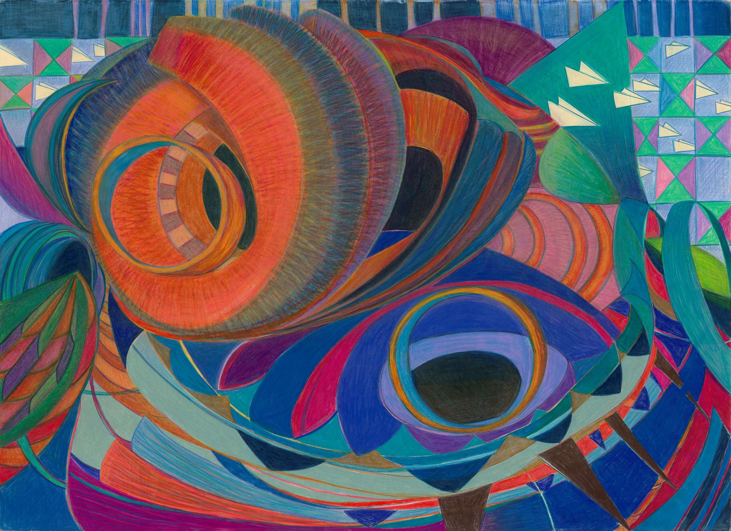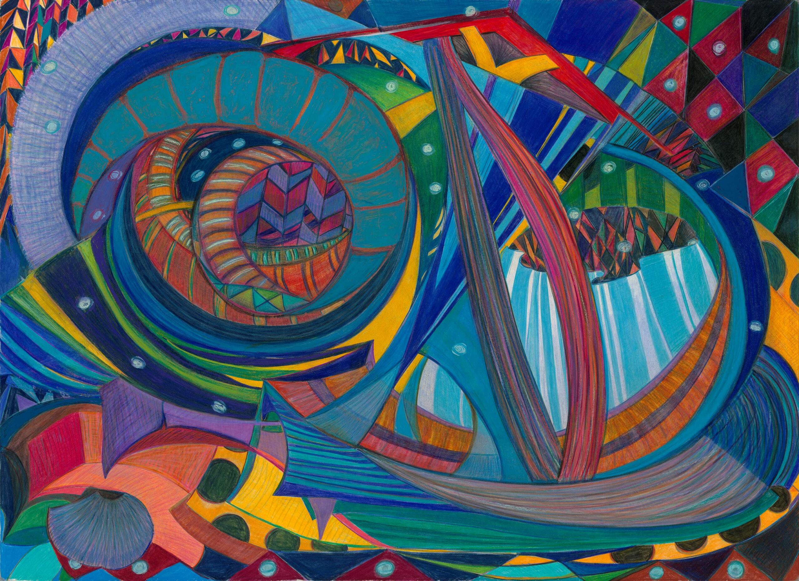 The fabric of the universe itself is expanding, driven by dark energy, which makes up the majority of the universe and is hidden from our everyday senses – that is – until the fabric of the universe reveals itself and/or speaks to us. Here, the artist takes us with her as the universe reveals itself.
