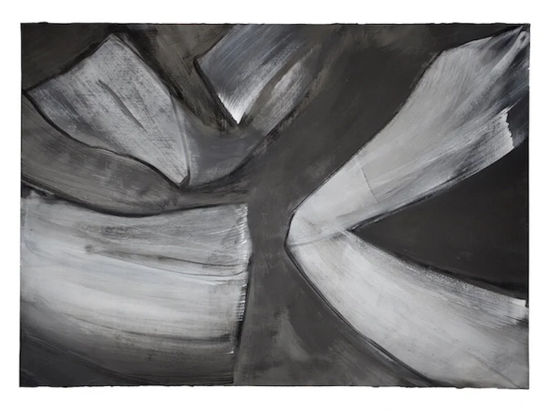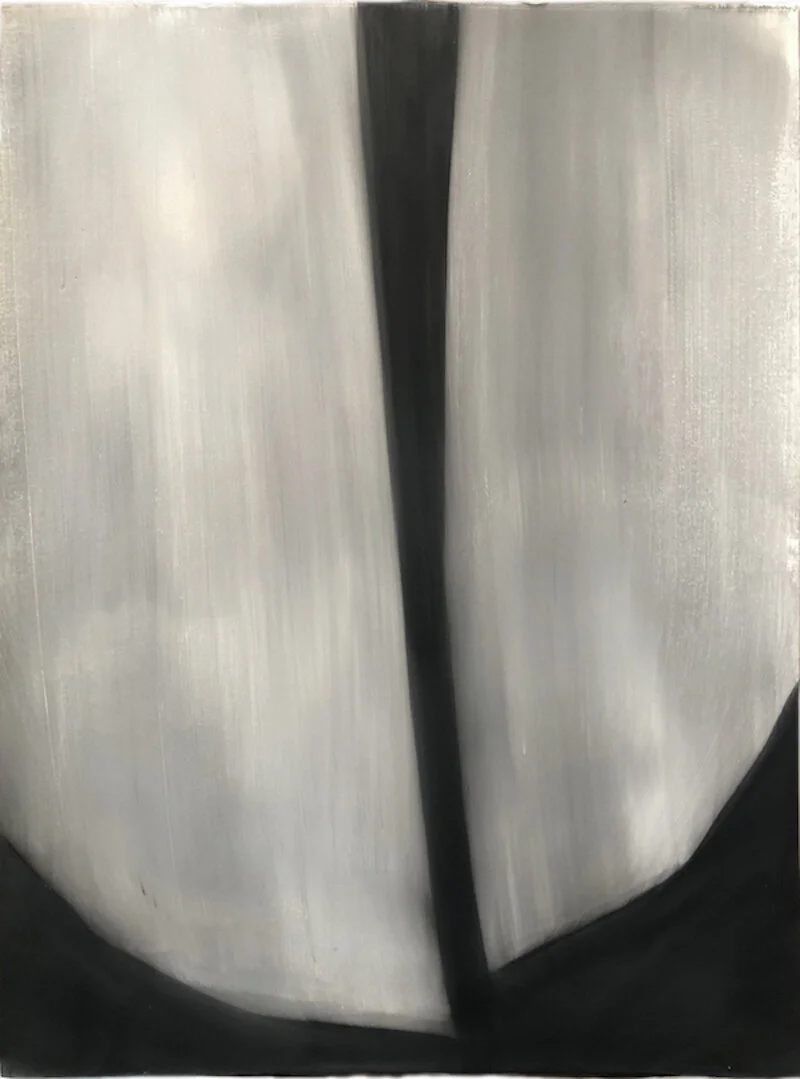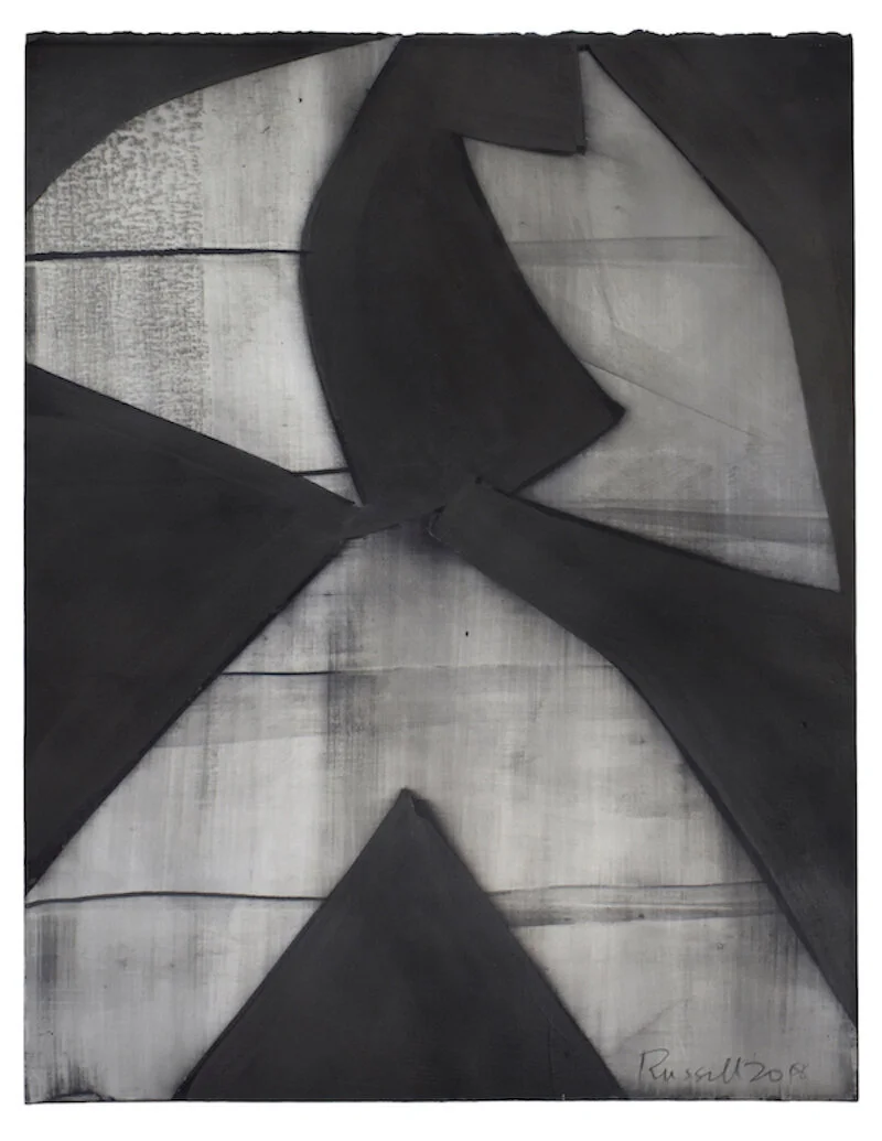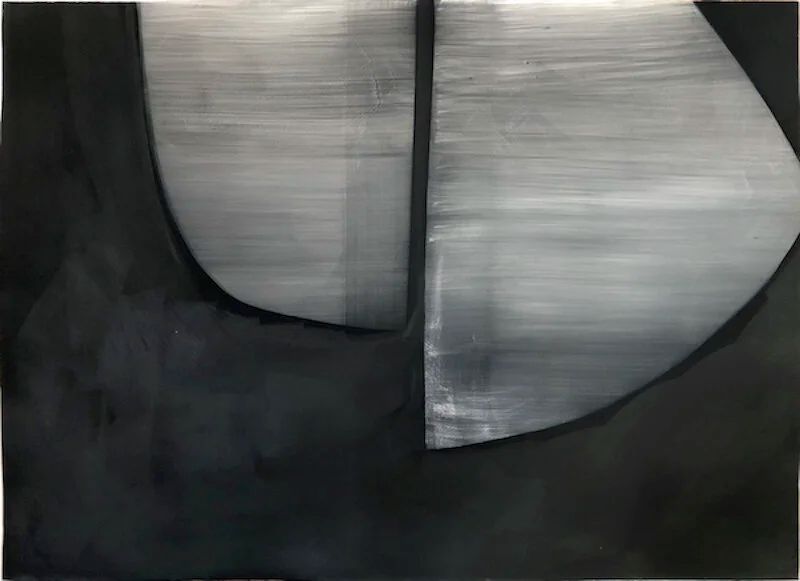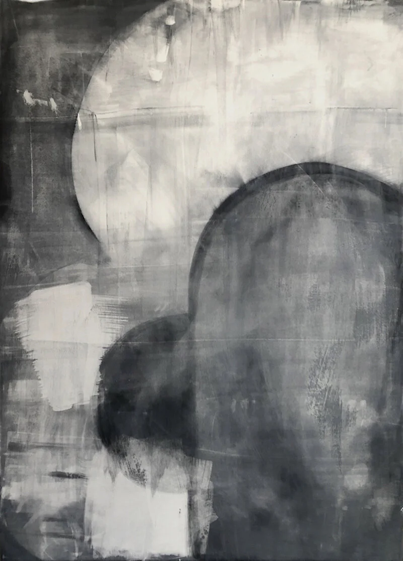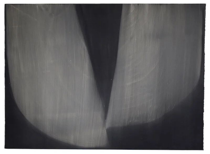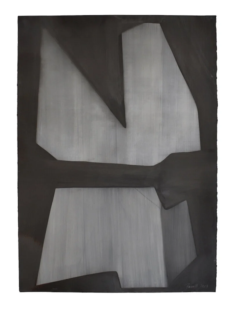 In Kronos II, the artist sheds color completely using a variety of materials to create depth of black and shadows. This simplicity leads to an “other worldly” quality where the works on paper become paintings.